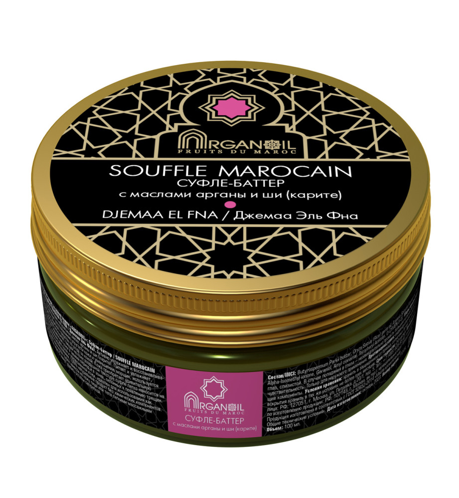 Суфле-баттер (взбитое масло карите с маслом арганы) марки "ARGANOIL FRUITS DU MAROC" (DJEMAA EL FNA/ДЖЕМАА ЭЛЬ ФНА Аромат амбра-мускус) активно увлажняет и восстанавливает кожу благодаря комплексу ухаживающих масел карите (ши) и арганы. Питает и увлажняет, борется с сухостью кожи, способствует восстановлению упругости кожи и уменьшению морщин, используется в качестве витаминизирующего и защитного средства по уходу за кожей. Кожа приобретает удивительную бархатистость и мягкость. Благодаря роскошной, тающей на коже воздушной кремообразной текстуре суфле-баттер легко наносится на кожу. Подходит для всех типов кожи, особенно для сухой и обезвоженной кожи. Идеален для использования как массажного средства. Экономичен в использовании. Не содержит химических консервантов, SLS и парабенов. 100% натуральный продукт без химических компонентов.