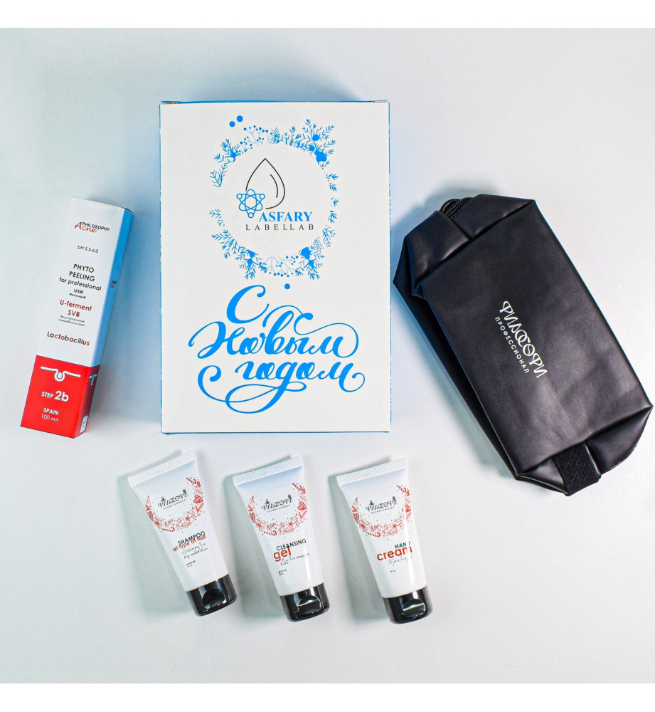 Philosophy Set New Year 2025 / Подарочный набор: фитопиллинг, крем для рук, гель для умывания, шампунь и косметичка